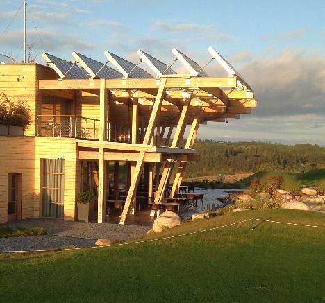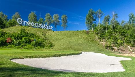 Greensgate klubbhus og hotell med 18. green i forgrunnen.