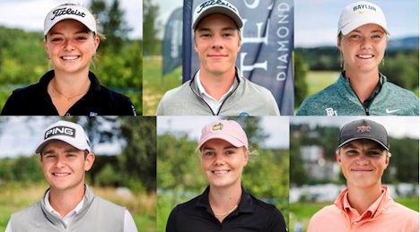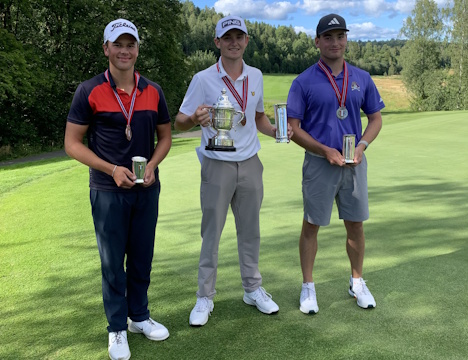 Fra premieutdelingen i NextUp Junior Invitational 2025. Fra venstre vinneren Emil Børrestuen Herstad, Losby, Leon Sebastian Hauger, Oslo og Viktor Hovland.