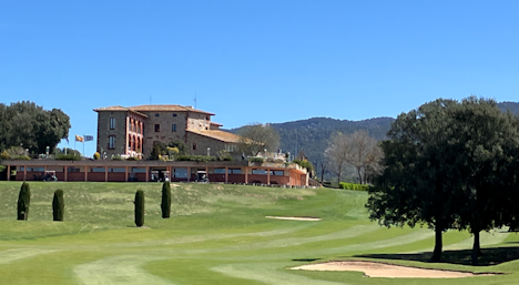 Klubbhuset er et flott tradisjonelt katalansk steinhus, her sett fra fairwayen på hull 18.