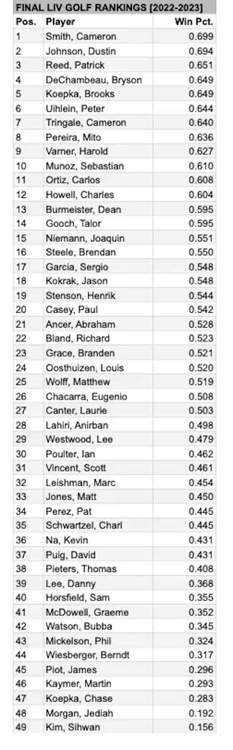 Det er blitt lagd en oversikt over LIV Golf-ligaens beste spillere i de to årene