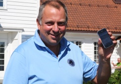 leder Jørgen Gierløff på Nøtterøy GK viser stolt fram en telefon med appen som