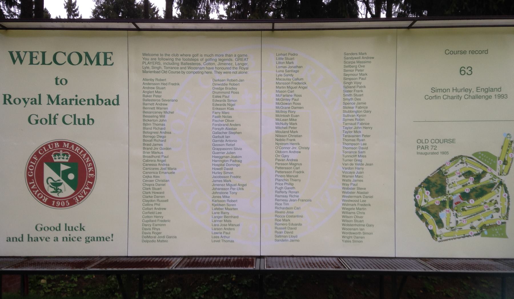 Disse spillerne har fått navnet sitt oppført på skiltet ved første hull. Banerekordinnehaveren står til høyre. Her er det mange kjente navn.