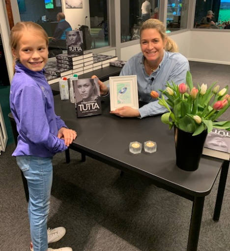 Her signerer Tutta sin bok til klubbvenninnen Nora Sophie Johnsen (11). Hun