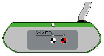 Også en putter har som regel sin sweetspot 5-15 mm mot hælen, sett i forhold til et punkt rett under markeringen på toppen, se figuren under.  Her markerer rødt køllens virkelige sweetspot og hvitt det som ofte blir oppfattet som sweetspot: